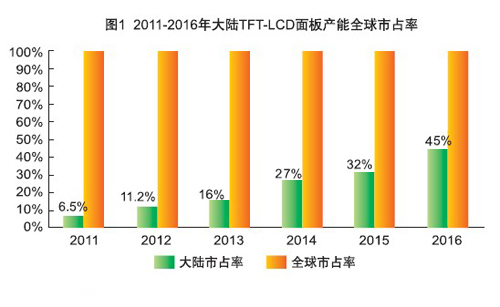 據(jù)Quarkdisplay預(yù)估,2016年大陸地區(qū)大尺寸TFT-LCD面板產(chǎn)能占全球產(chǎn)能比重為40%,中小尺寸TFT-LCD面板產(chǎn)能比重則更高,達(dá)到60%,整體TFT-LCD面板產(chǎn)能占全球比重則將由2011年的6.5%迅速增加至2016年的45%,與韓國、臺灣兩地形成三大生產(chǎn)重心。